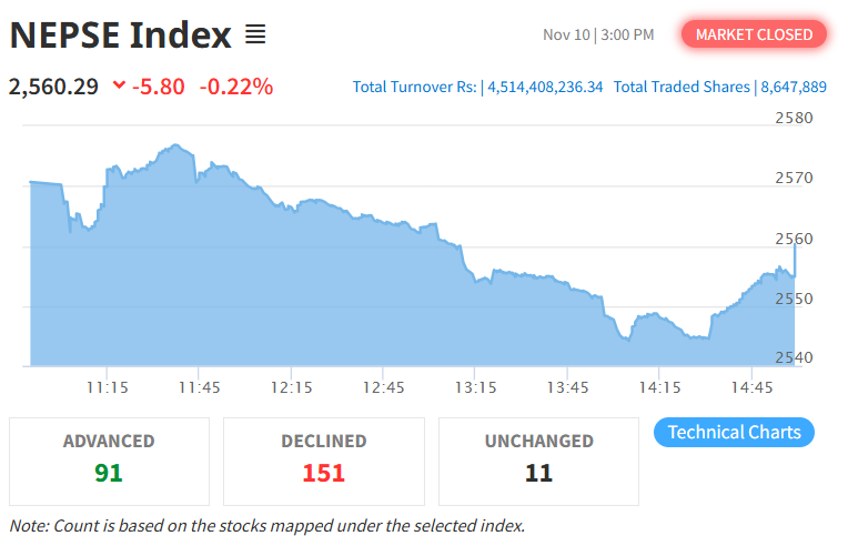 सोमबार नेप्से परिसूचक ५.८० अंक घटेर २५६०.२९ विन्दुमा झरेको छ। त्यस्तै, यस दिन सेन्सेटिभ इण्डेक्स १.०५ अंक घटेको छ भने फ्लोट इण्डेक्स ०.५० अंक र सेन्सेटिभ फ्लोट इण्डेक्स ०.३४ अंक घटेको छ।