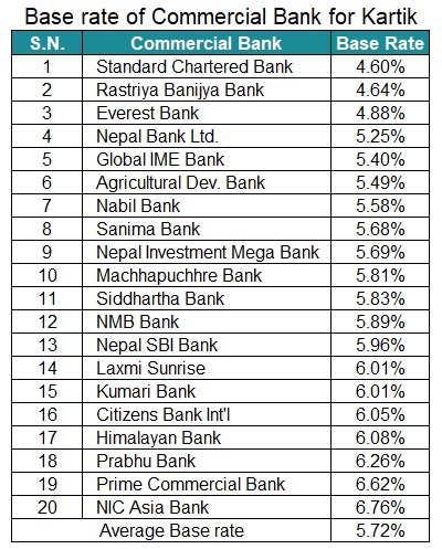 वाणिज्य बैंकहरूले कात्तिकका लागि सार्वजनिक गरेको बेसरेट अनुसार औसत बेसरेट ५.७२ प्रतिशतमा झरेको छ । यो २०७८ साउन यताकै सस्तो हो । वाणिज्य बैंकहरुको औसत बेस रेट कोभिडकै समयमा पनि ६.५९ प्रतिशतभन्दा तल आएको छैन ।