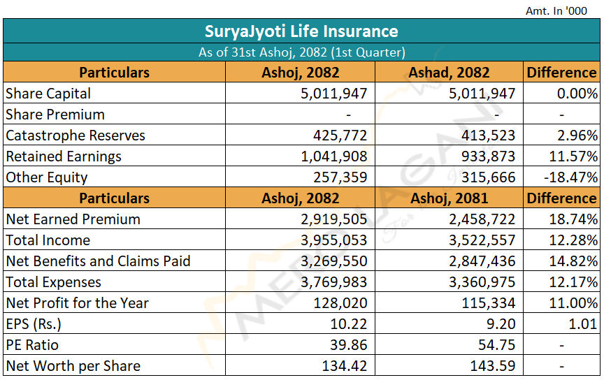 नाफासँगै इन्स्योरेन्सको प्रतिशेयर आम्दानी पनि सामान्य बढेको छ। समीक्षा अवधिमा इन्स्योरेन्सको यस्तो आम्दानी १ रुपैयाँ १ पैसा बढेर १० रुपैयाँ २२ पैसा पुगेको छ। असोज मसान्तसम्ममा इन्स्योरेन्सको प्रतिशेयर नेटवर्थ १३४ रुपैयाँ ४२ पैसा रहेको छ भने मूल्य आम्दानी अनुपात ३९.८६ गुणा रहेको छ।