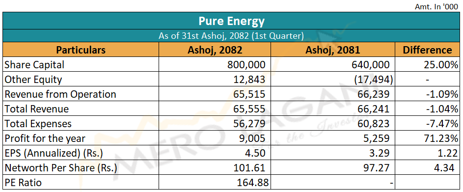 चालु आर्थिक वर्षको पहिलो तीन महिनासम्ममा कम्पनीले ९० लाख ५ हजार रुपैयाँ खुद नाफा कमाएको छ। यो गत आर्थिक वर्षको सोही अवधिको तुलनामा ७१.२३ प्रतिशत बढी हो। गत आर्थिक वर्षको सोही अवधिमा कम्पनीले ५२ करोड ५९ लाख रुपैयाँ खुद नाफा कमाएको थियो।