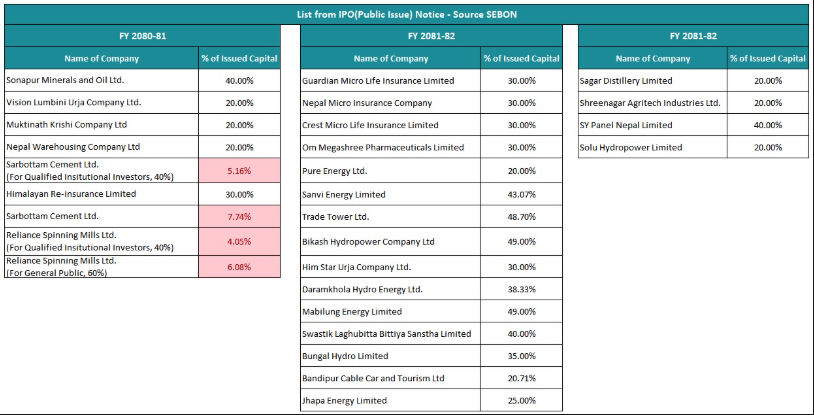 पछिल्लो वर्षदेखि धितोपत्र बोर्डले दिएको निष्कासन अनुमतिलाई हेर्ने हो भने बोर्डले २० प्रतिशत भन्दा कम शेयर निष्कासन अनुमति माग्नेलाई निरुत्साहित गर्दै आइरहेको छ। जबकि आर्थिक वर्ष २०८०/८१ सम्म बोर्डले १० प्रतिशतसम्म पनि निष्कासन अनुमति दिएको थियो। आर्थिक वर्ष २०८०/८१ सर्वोत्तम सिमेन्टले कुल १३ प्रतिशत शेयर निष्कासन गर्ने अनुमति पाएको थियो भने रिलायन्स स्पिनिङ मिलले १० प्रतिशत मात्रै शेयर निष्कासनको अनुमति पाएको थियो। तर स्मरण रहोस् दुवै कम्पनीले बुक बिल्डिङ विधिमार्फत शेयर निष्कासन अनुमति पाएका हुन्।
