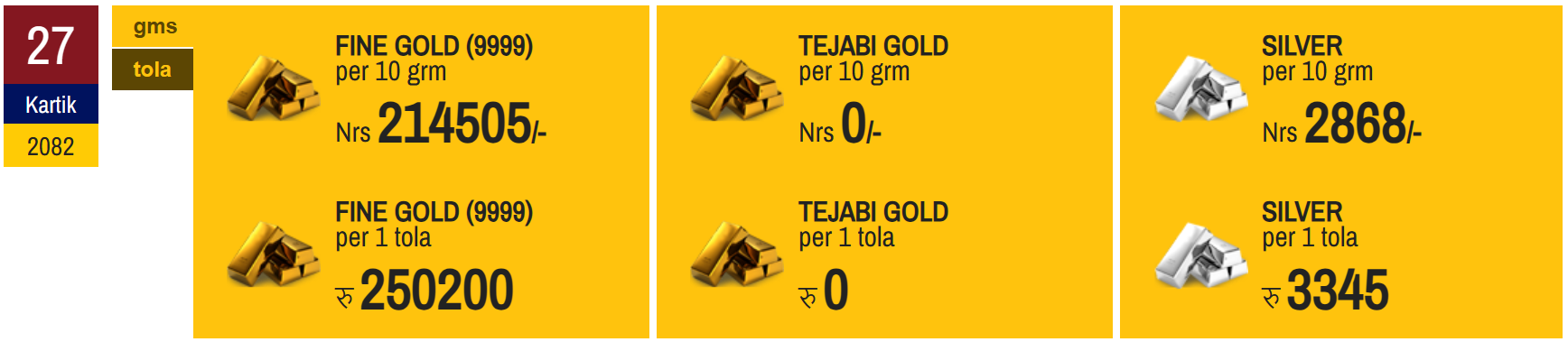 नेपाल सुनचाँदी व्यवसायी महासंघका अनुसार यस दिन छापावाल सुन प्रतितोला २ लाख ५० हजार २०० रुपैयाँमा कारोबार भइरहेको छ । बुधबारको बजारमा छापावाल सुन प्रतितोला २ लाख ४४ हजार ३०० रुपैयाँमा कारोबार भएको थियो । सुनको मूल्य एकै दिन भारि वृद्धि भएको हो ।