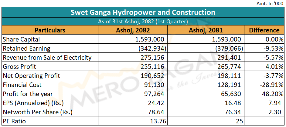 समीक्षा अवधिमा विद्युत बिक्री आम्दानी ५.५७ प्रतिशत घटेको छ भने कुल नाफा ४.०१ प्रतिशत घटेको छ। त्यस्तै, कम्पनीको कुल सञ्चालन मुनाफा समीक्षा अवधिमा ३.७७ प्रतिशत घटेको छ। कम्पनीको वित्तीय खर्च समीक्षा अवधिमा २८.९१ प्रतिशत घटेको छ। जसका कारण कम्पनीको नाफा बढ्न पुगेको हो।