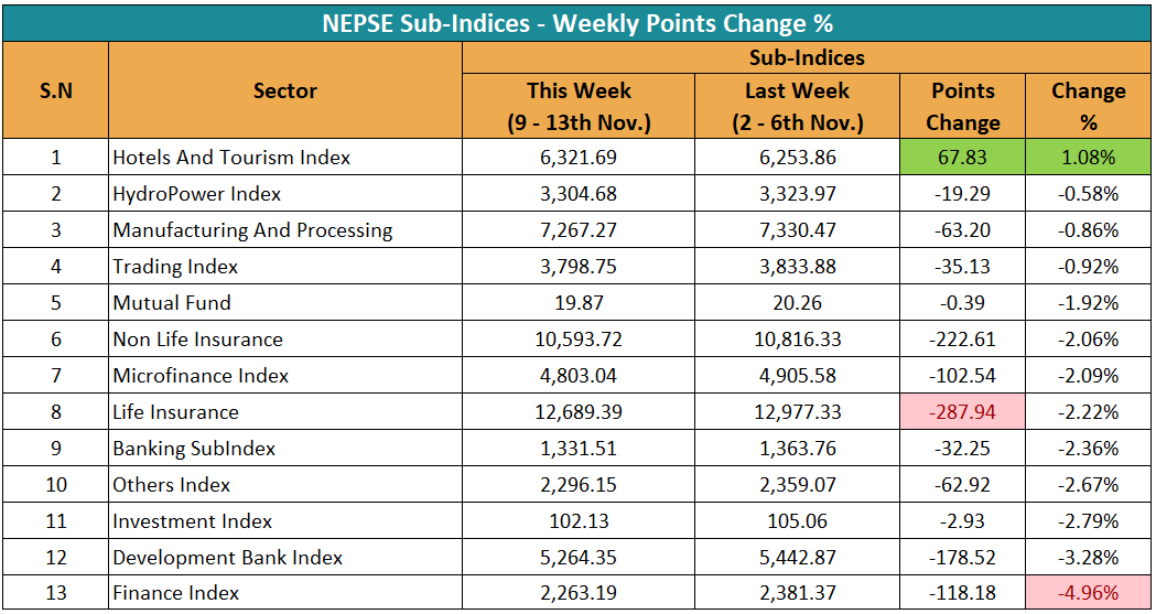 यस साता १ उपसमूहको परिसूचक बढेको छ भने १२ उपसमूहको परिसूचक घटेको छ। यस साता होटल तथा पर्यटन उपसमूहको परिसूचक १.०८ प्रतिशत बढेको हो। गत साता ६२५३.८६ विन्दुमा बन्द भएको यस उपसमूहको परिसूचक, यस साता ६७.८३ अंक बढेर ६३२१.६९ विन्दुमा पुगेको छ।