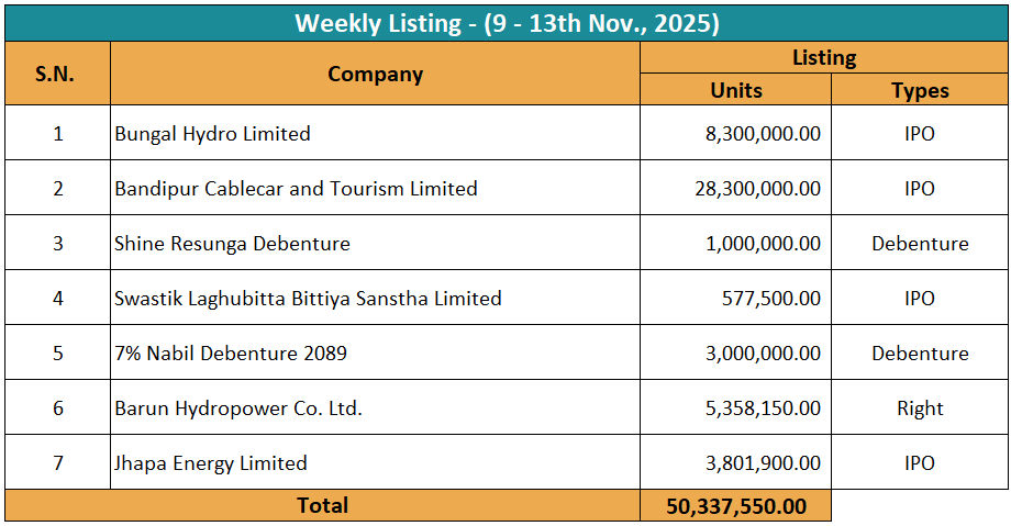 यस साता ७ कम्पनीको ५ करोड ३ लाख ३७ हजार ५५० कित्ता शेयर नेप्सेमा सूचीकृत भएको छ। यस साता झापा इनर्जी, बुङ्गल हाइड्रो, बन्दीपुर केबलकार एण्ड टुरिजम र स्वस्तिक लघुवित्त वित्तीय संस्थाको आईपीओ नेप्सेमा सूचीकृत भएको हो भने बरुण हाइड्रोपावरको हकप्रद शेयर नेप्सेमा सूचीकृत भएको हो। त्यस्तै, यस साता शाइन रेसुङ्गा डिबेञ्चर र ७ प्रतिशत नबिल डिबेञ्चर २०८९ पनि नेप्सेमा सूचीकृत भएको हो।