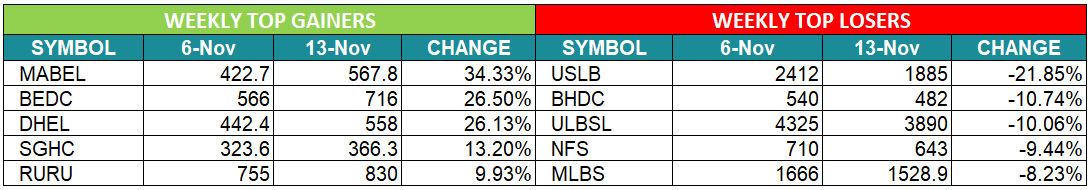 यस साता माबिलुङ्ग इनर्जीको शेयरमूल्य सर्वाधिक ३४.३३ प्रतिशत बढेको छ। गत साता ४२२ रुपैयाँ ७० पैसामा अन्तिम कारोबार भएको यस कम्पनीको शेयर यस साता ५६७ रुपैयाँ ८० पैसामा अन्तिम कारोबार भएको छ। त्यस्तै, यस साता भुगोल इनर्जी डेभलपमेन्ट कम्पनीको शेयरमूल्य साढे २६ प्रतिशत बढेको छ भने दरमखोला हाइड्रो इनर्जीको शेयरमूल्य २६ प्रतिशतभन्दा बढी बढेको छ। यस साता उन्नती सहकार्य लघुवित्त वित्तीय संस्थाको शेयरमूल्य सर्वाधिक २१.८५ प्रतिशत घटेको छ। त्यस्तै, यस साता विन्ध्यबासिनी हाइड्रोपावर डेभलपमेन्ट कम्पनी र उपकार लघुवित्त वित्तीय संस्थाको शेयरमूल्य १० प्रतिशतभन्दा बढी घटेको छ।