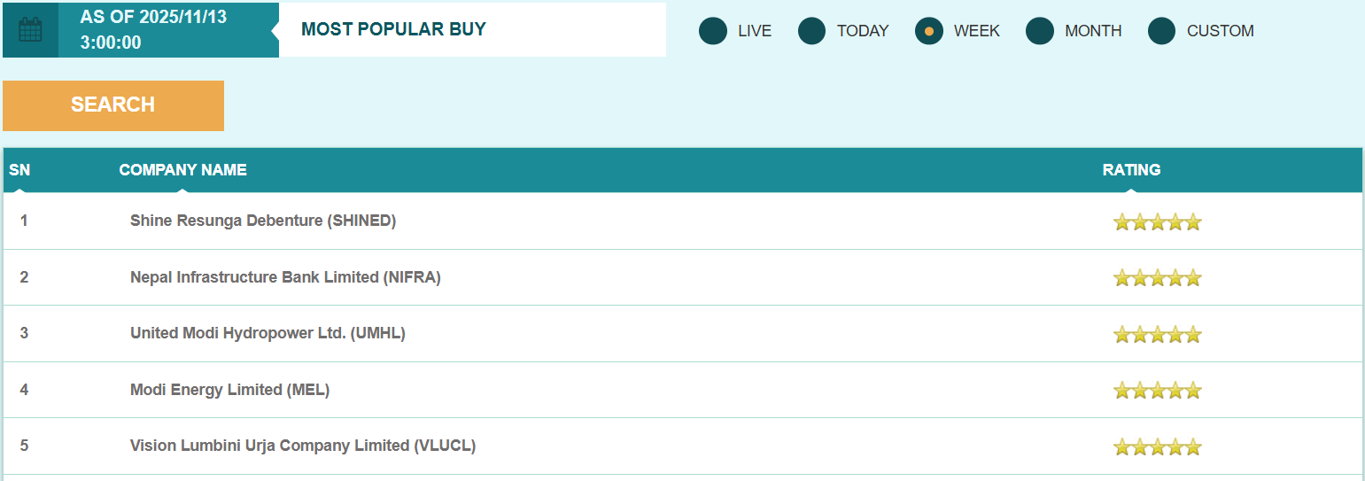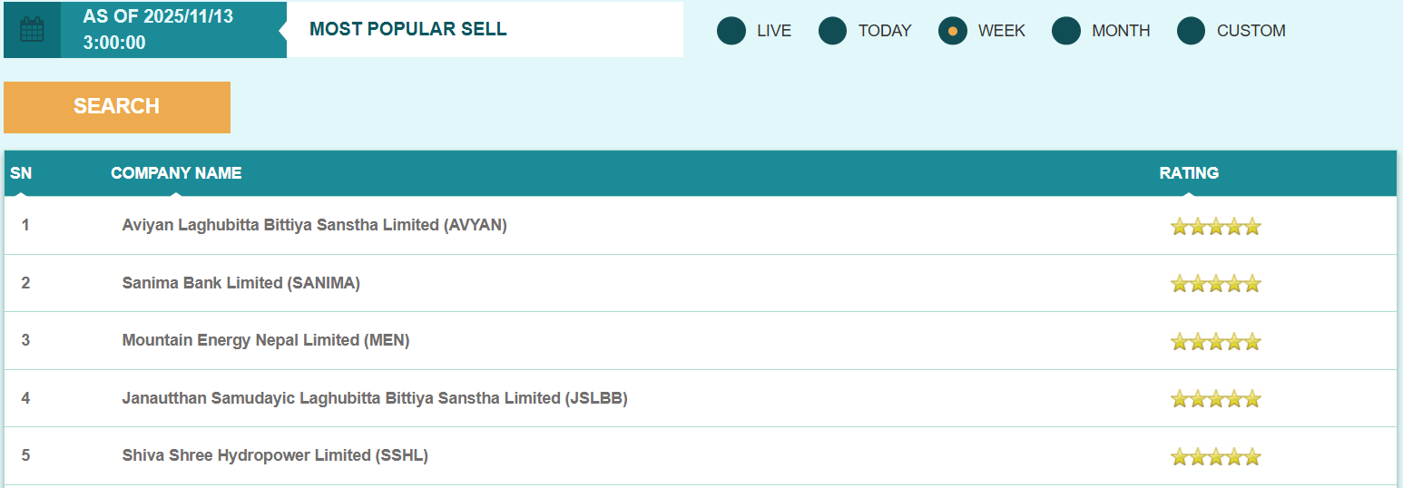 फ्लोरसिट विश्लेषण गर्दा यस साता शाइन रेसुङ्गा डिबेञ्चर, नेपाल इन्फ्रास्ट्रक्चर बैंक, युनाइटेड मोदी हाइड्रोपावर लगायतका स्टकहरु मोस्ट पपुलर बाइ स्टक सूचीको शीर्ष स्थानमा रहेका छन् भने अभियान लघुवित्त वित्तीय संस्था, सानिमा बैंक, माउन्टेन इनर्जी नेपाल लगायतका स्टकहरु मोस्ट पपुलर सेल स्टक सूचीको शीर्ष स्थानमा रहेका छन्।