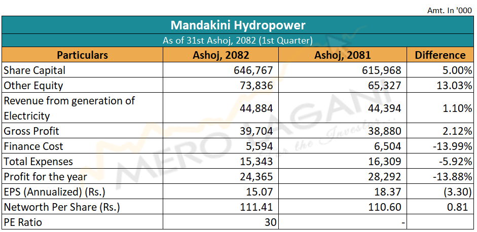 विद्युत बिक्री आम्दानी बढेपनि कम्पनीको खुद नाफा भने घटेको छ। समीक्षा अवधिमा कम्पनीको खुद नाफा १३.८८ प्रतिशत घटेर २ करोड ४३ लाख रुपैयाँमा सीमित भएको छ। समीक्षा अवधिमा कम्पनीको कुल नाफा २.१२ प्रतिशत बढेको छ भने वित्तीय खर्च १३.९९ प्रतिशत घटेको छ।