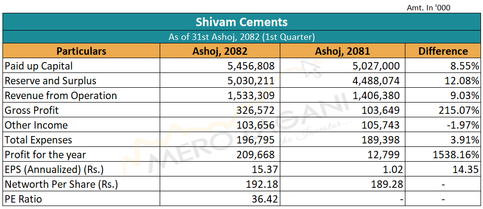 समीक्षा अवधिमा कम्पनीको बिक्री आम्दानी ९.०३ प्रतिशत बढेको छ भने कुल नाफा २१५.०७ प्रतिशत बढेको छ। कम्पनीको अन्य आम्दानी भने समीक्षा अवधिमा १.९७ प्रतिशत घटेको छ।