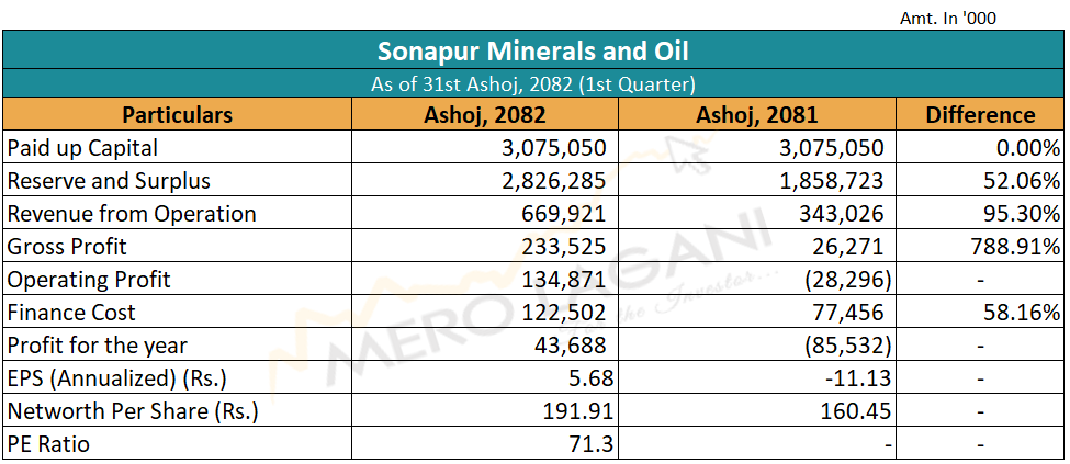 समीक्षा अवधिमा कम्पनीको बिक्री आम्दानी ९५.३० प्रतिशत र कुल नाफा ७८८.९१ प्रतिशत बढेको छ। त्यस्तै, समीक्षा अवधिमा कम्पनीको वित्तीय खर्च ५८.१६ प्रतिशत बढेको छ भने सञ्चालन मुनाफा २ करोड ८२ लाख रुपैयाँ ऋणात्मकबाट १ करोड ३४ लाख रुपैयाँ धनात्मक भएको छ।