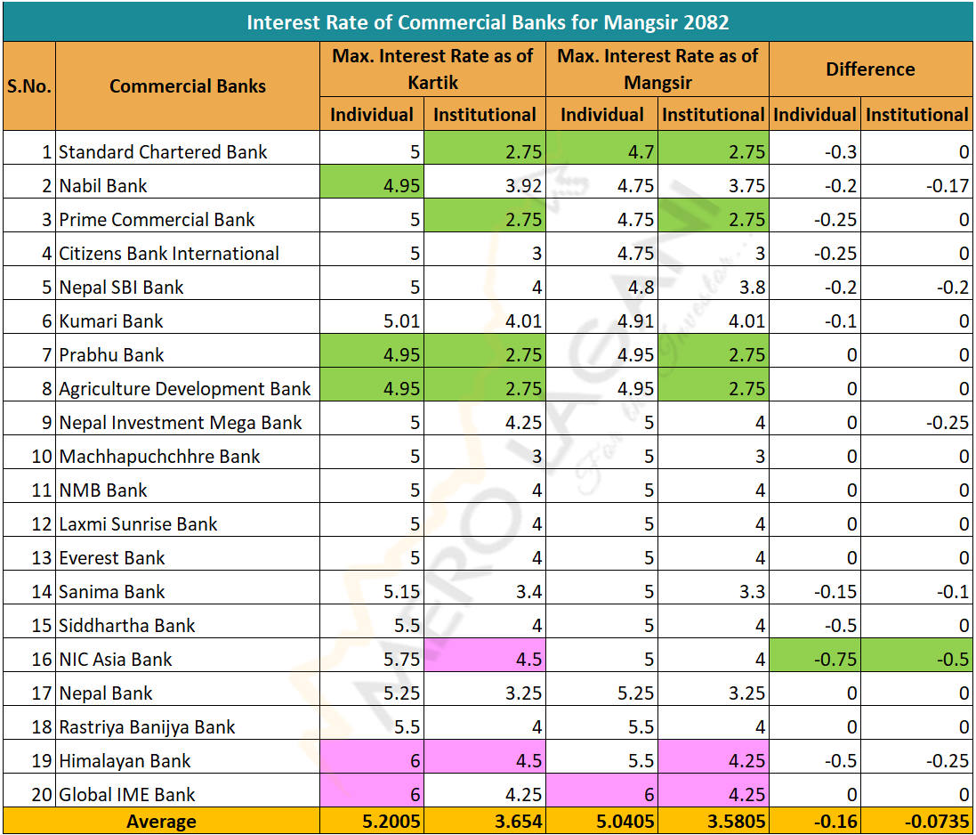 कात्तिक महिनाको तुलनामा मंसिर महिनामा बैंकहरुको औषत ब्याजदर घटेको छ। व्यक्तिगत मुद्दती निक्षेपको अधिकतम औषत ब्याजदर, कात्तिक महिनाको तुलनामा मंसिर महिनामा ०.१६ प्रतिशतविन्दुले घटेको छ। कात्तिकमा बैंकहरुले औषतमा ५.२० प्रतिशतविन्दुका दरले ब्याज दिएका थिए। मंसिरमा भने सो घटेर ५.०४ प्रतिशतविन्दुमा झरेको छ। त्यस्तै, संस्थागत मुद्दती निक्षेपको ब्याजदर भने समीक्षा अवधिमा ०.०७ प्रतिशतविन्दुले घटाएका छन्।