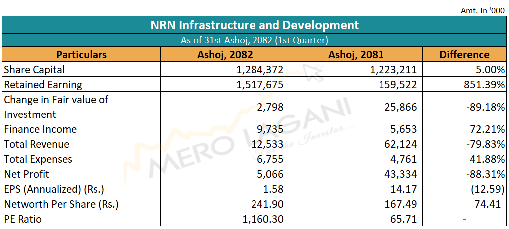 समीक्षा अवधिमा कम्पनीको फेर भ्यालु अफ इन्भेष्टेमन्ट ८९.१८ प्रतिशत घटेको छ भने वित्तयि आम्दानी ७२.२१ प्रतिशत बढेको छ। त्यस्तै, कम्पनीको कुल आम्दानी ७९.८३ प्रतिशत घटेको छ भने कुल खर्च ४१.८८ प्रतिशत घटेको छ।