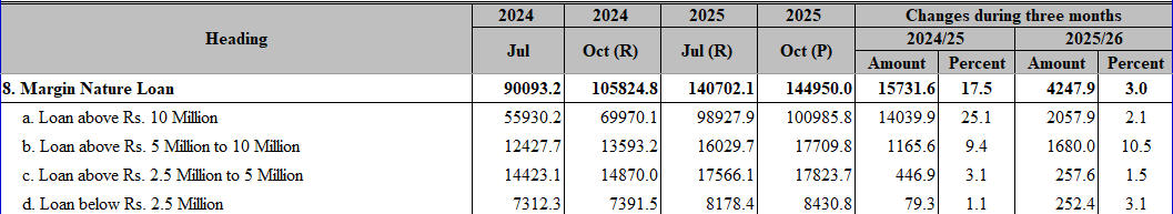 विवरण अनुसार असोजमा मार्जिन प्रकृतिको कर्जा तीन प्रतिशतले बढेको छ। केन्द्रीय बैंकका अनुसार असोजसम्म मार्जिन प्रकृतिको कर्जा मात्रै कुल एक खर्ब ४४ अर्ब ९५ करोड रुपैयाँ प्रवाह भएको छ। गत असार मसान्तसम्म उक्त प्रकृतिको कर्जा एक खर्ब ४० अर्ब ७० करोड रुपैयाँ मात्रै प्रवाह भएको थियो। जुन तीन प्रतिशतको बृद्धि हो। गएको तीन महिनामा मात्रै बैंक वित्तीय संस्थाले चार अर्ब २४ करोड रुपैयाँ शेयर धितो कर्जा दिएका छन्।
