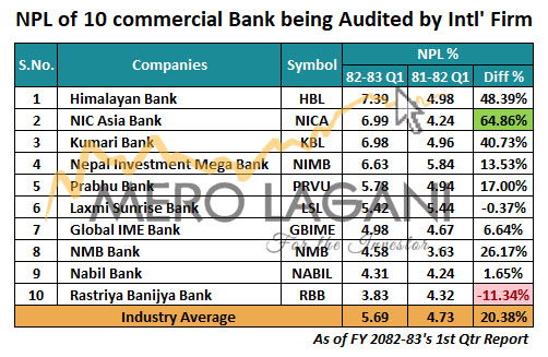 राष्ट्र बैंकले पूर्ण लेखा परिक्षणका लागि ग्लोबल आइएमई बैंक, नबिल बैंक, नेपाल इन्भेष्टमेन्ट मेगा बैंक, कुमारी बैंक, राष्ट्रिय वाणिज्य बैंक, लक्ष्मी सनराइज बैंक, हिमालयन बैंक, एनआइसी एसिया बैंक, एनएमबी बैंक र प्रभु बैंक गरी १० बैंक छनोट गरेको थियो । छनोटमा परेका १० वाणिज्य बैंकमध्ये राष्ट्रिय वाणिज्य बैंक र लक्ष्मी सनराइज बैंकको मात्रै खराब कर्जा अघिल्लो आवको पहिलो त्रैमासको तुलनामा घटेको छ ।