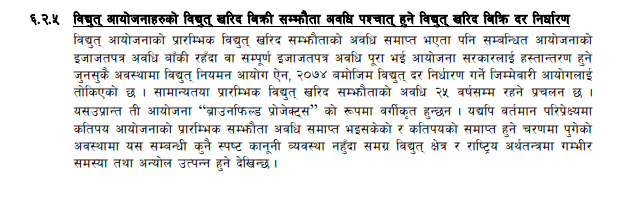 ६ वटा जलविद्युत् आयोजना किटान गरेर नै आयोगले प्रारम्भिक पीपीए अवधि सकिएका ती ‘ब्राउनफिल्ड प्रोजेक्ट्स’ प्रभावकारी रुपमा सञ्चालन गर्न आवश्यक प्रावधान, संरचना र नीतिगत व्यवस्था समयमै तयार गर्न अविलम्ब गर्न उचित हुने सुझाव दिएको हो ।
