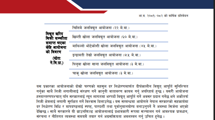 त्यस्तैगरी, ६० मेगावाटको खिम्ती खोला जलविद्युत् आयोजना, ४५ मेगावाटको माथिल्लो भोटेकोशी, ७.५ मेगावाटको इन्द्रावती तेस्रो, ३ मेगावाटको पिलुवाखोला साना जलविद्युत् आयोजना, ३ मेगावाटको चाकु खोला जलविद्युत् आयोजनाको पीपीए अवधि सकिएको हो ।