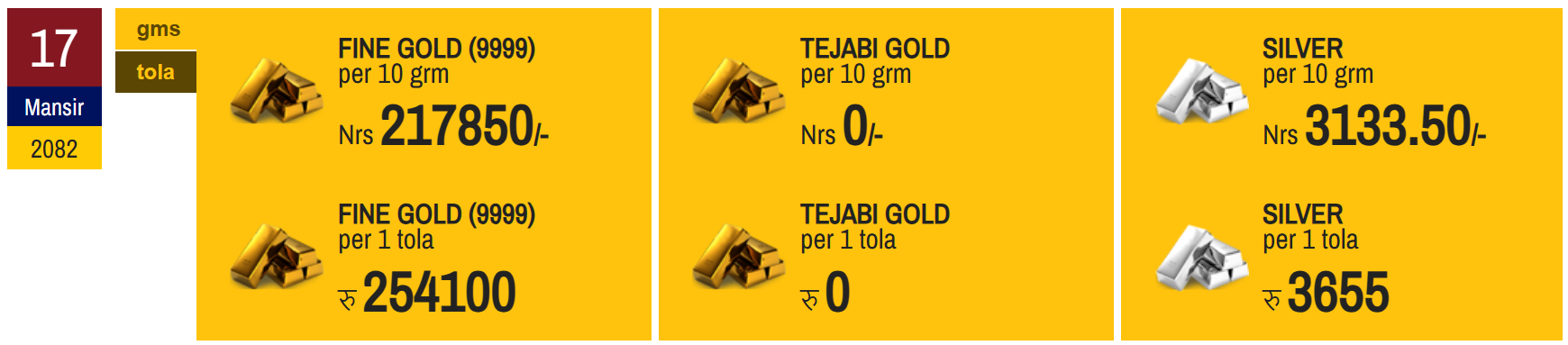 नेपाल सुनचाँदी व्यवसायी महासंघका अनुसार यस दिन छापावाल सुन प्रतितोला २ लाख ५४ हजार १०० रुपैयाँमा कारोबार भइरहेको छ । अघिल्लो दिन अर्थात मंगलबार छापावाला सुन प्रतितोला २ लाख ५३ हजार ३०० रुपैयाँमा कारोबार भएको थियो।