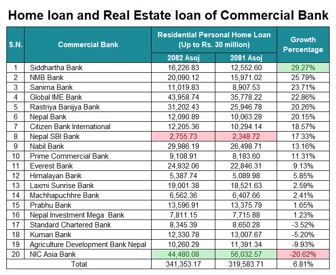 यता सानिमा बैंकले ११ अर्ब १ करोड, कृषि विकास बैंकले १९ अर्ब २६ करोड, प्राइम कमर्सियल बैंकले ९ अर्ब १० करोड, स्ट्यान्डर्ड चार्टर्ड बैंकले ३ अर्ब ३४ करोड, नेपाल इन्भेष्टमेन्ट मेगा बैंकले ७ अर्ब ८१ करोड, माछापुच्छे् बैंकले ६ अर्ब ५६ करोड, हिमालयन बैंकले ५ अर्ब ३८ करोड र नेपाल एसबीआई बैंकले सबैभन्दा कम २ अर्ब ७५ करोड रुपैयाँ घर कर्जा दिएका छन् ।