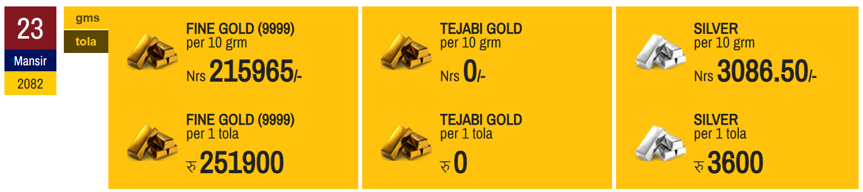 नेपाल सुनचाँदी व्यवसायी महासंघका अनुसार यस दिन सुनको मूल्य प्रतितोला २ लाख ५१ हजार ९०० रुपैयाँ कायम भएको छ । अघिल्लो दिन अर्थात साेमबार, यस्तो सुन प्रतितोला २ लाख ५२ हजार ९०० रुपैयाँमा कारोबार भएको थियो।