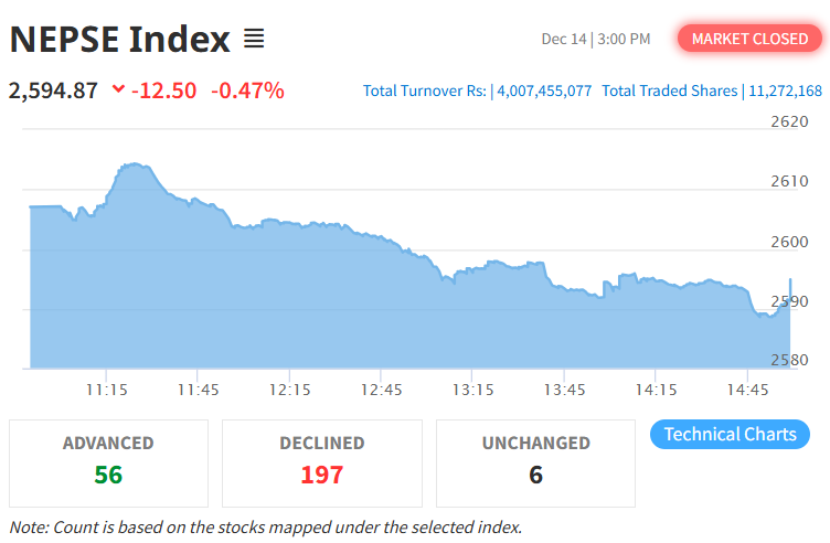 यस दिन नेप्से घटेसँगै २६०० विन्दुभन्दा तल झरेको छ। नेप्से परिसूचक १४ कारोबार दिनपछि २६०० विन्दुभन्दा तल झरेको हो। यस अघि गत मंसिर ४ गते नेप्से २६०० विन्दुमुनि बन्द भएको थियो।