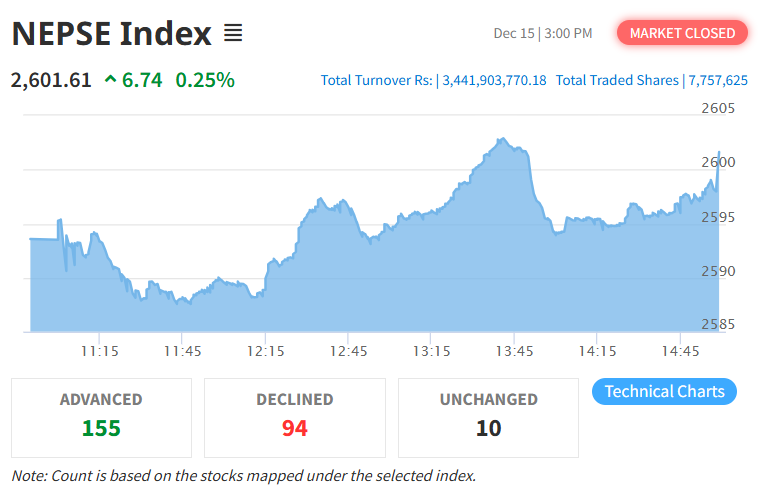 सोमबार नेप्से परिसूचक ६.७४ अंक बढेर २६०१.६१ विन्दुमा पुगेको छ। त्यस्तै, यस दिन सेन्सेटिभ इण्डेक्स २.०१ अंक बढेको छ भने फ्लोट इण्डेक्स ०.६२ अंक र सेन्सेटिभ इण्डेक्स ०.७८ अंक बढेको छ।