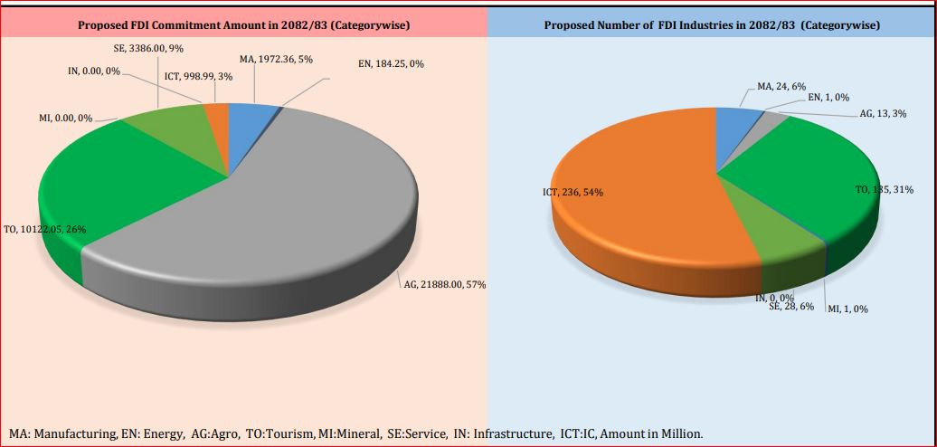 यद्यपी लगानी रकमका हिसाबले भने कृषि तथा वनजन्य उद्योग क्षेत्र सबैभन्दा बढि लगानी प्रतिवद्धता आएको छ । यस क्षेत्रमा मात्रै करिब २२ अर्ब रुपैयाँ बराबरको वैदेशिक लगानी प्रतिबद्धता आएको छ । त्यस्तै, पर्यटन क्षेत्रले उल्लेख्य स्थान ओगटेको छ, सो क्षेत्रका १ सय ३५ वटा परियोजनामार्फत १० अर्ब रुपैयाँभन्दा बढी लगानी प्रस्ताव आएको उद्योग विभागको तथ्यांकमा उल्लेख छ ।
