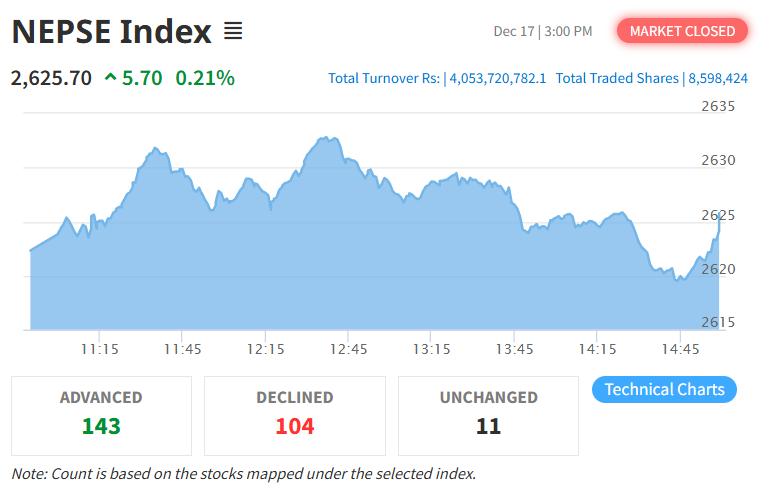 यस दिन नेप्से परिसूचक ५.७० अंक बढेर २६२५.७० विन्दुमा पुगेको छ। त्यस्तै, यस दिन सेन्सेटिभ इण्डेक्स १.१८ अंक बढेको छ भने फ्लोट इण्डेक्स ०.५२ अंक र सेन्सेटिभ फ्लोट इण्डेक्स ०.४४ अंक बढेको छ।