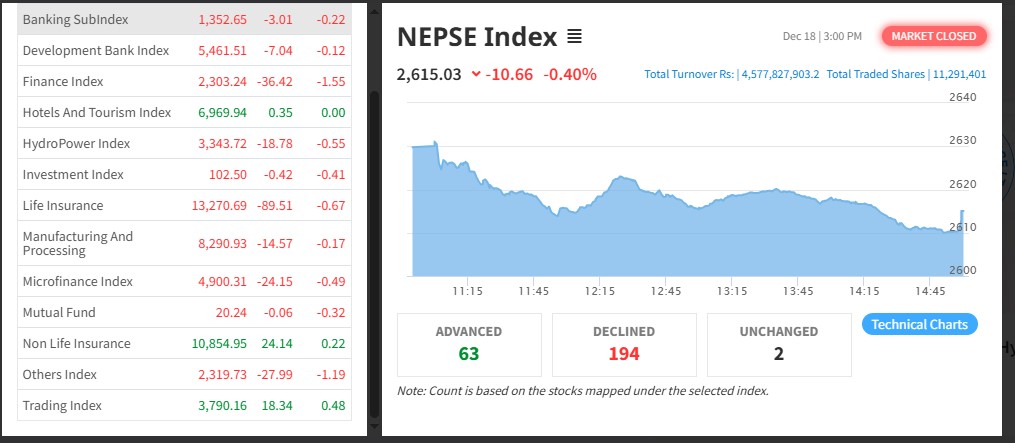 यस दिन नेप्से परिसूचक १०.६६ अंक घटेर २६१५.०३ विन्दुमा झरेको छ । त्यस्तै, यस दिन सेन्सेटिभ इण्डेक्स १.६३ अंक घटेको छ भने फ्लोट इण्डेक्स ०.७० अंक र सेन्सेटिभ फ्लोट इण्डेक्स ०.४१ अंक घटेको छ ।
