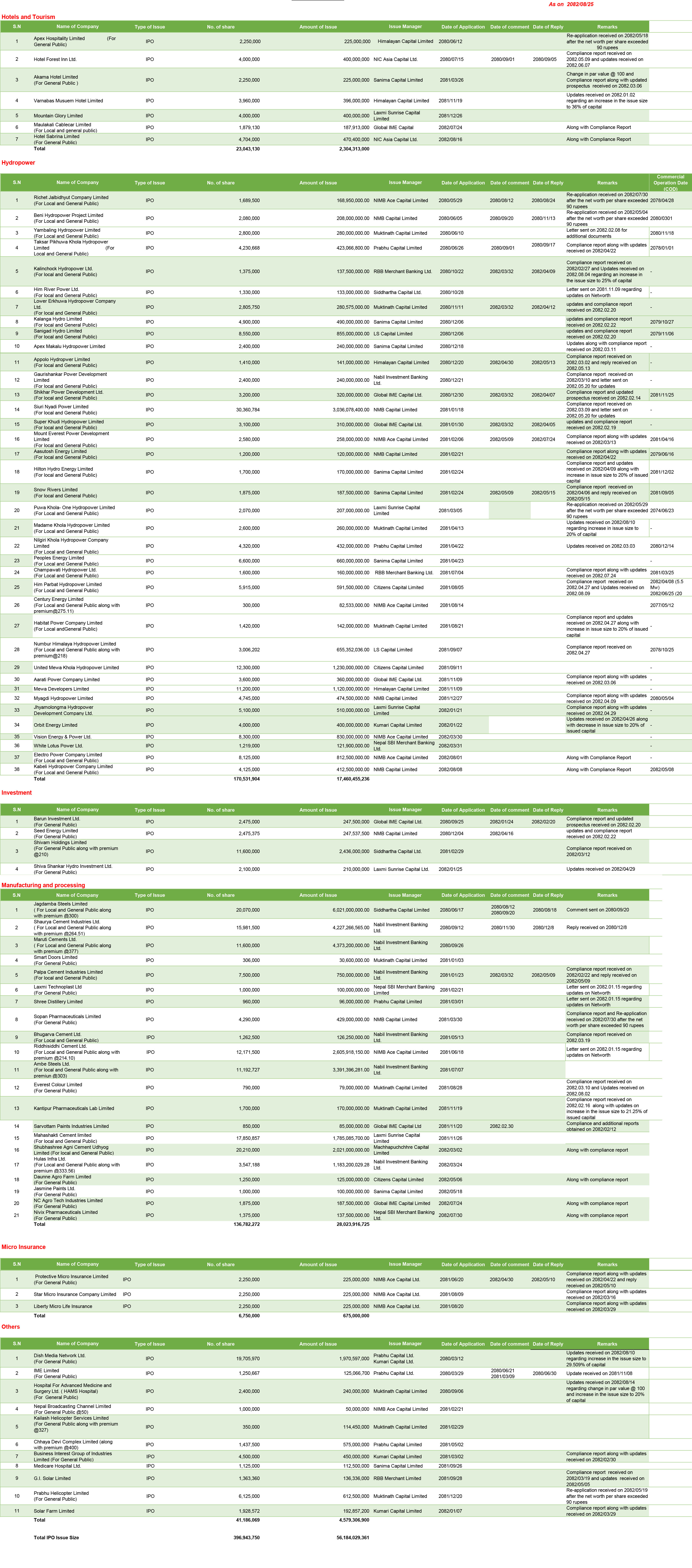 जलविद्युत क्षेत्रबाट नुम्बर हिमालयन हाइड्रोपावरले २१८ रुपैयाँमा र सेञ्चुरी इनर्जी लिमिटेडले २७५.११ रुपैयाँमा आइपीओ निष्काशन गर्न अनुमति मागेको छ भने लगानी समूहबाट शिवम होल्डिङस् लिमिटेडले २१० रुपैयाँमा आइपीओ निष्काशन गर्न अनुमति मागेको छ । यता सबैभन्दा बढी उत्पादन तथा प्रशोधन समूहबाट जगदम्बा स्टिल्सले ३०० रुपैयाँमा, सौर्य सिमेन्ट इन्डस्ट्रिजले २६४.५१ रुपैयाँ, रिद्धि सिद्धि सिमेन्टले २१४.१ रुपैयाँमा र हुलास इन्फ्रा लिमिटेडले ३३३.५६ रुपैयाँमा आईपीओ निष्काशन गर्न आवेदन दिएको छ ।