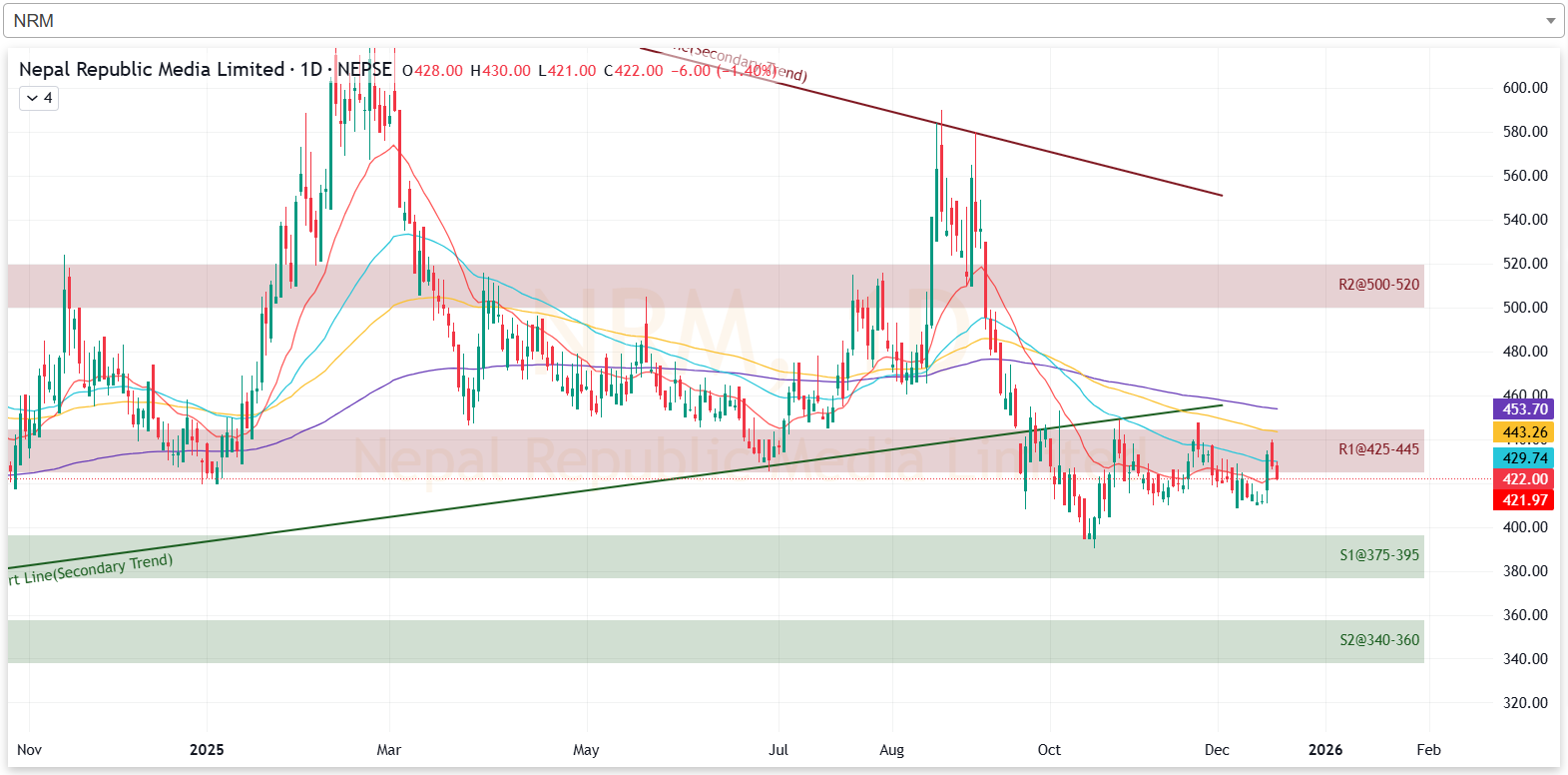 यस साता कम्पनीको शेयरमूल्य प्रतिरोध परीक्षण गरेर झरेको छ। हाल कम्पनीको प्रतिरोध क्षेत्र ४२५ देखि ४४५ सम्म रहेको छ। यस साताको मंगलबार बढेर प्रतिरोध क्षेत्रमा पुगेको कम्पनीको शेयरमूल्य, सोपश्चाचका दिनहरुमा घटेको हो। आगामी दिनमा पनि कम्पनीको शेयरमूल्यले गिरावटलाई निरन्तरता दिएमा ३७५ देखि ३९५ को क्षेत्रमा टेवा पाउने देखिन्छ।