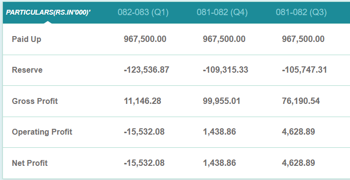 चालु आर्थिक वर्षको पहिलो त्रैमाससम्ममा कम्पनी १ करोड ५५ लाख ३२ हजार रुपैयाँ नोक्सानीमा रहेको छ। गत आर्थिक वर्षको सोही अवधिसम्ममा कम्पनी २४ लाख ६१ हजार रुपैयाँ नाफामा थियो।