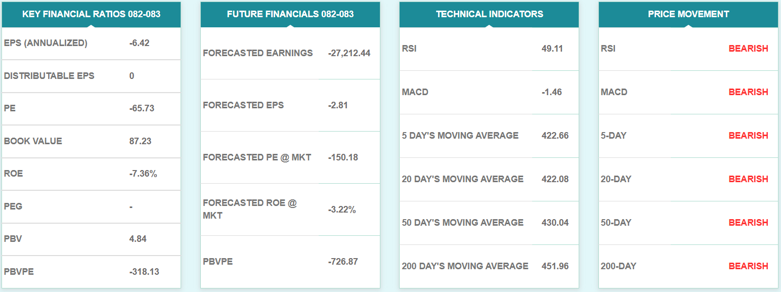 असोज मसान्तसम्ममा कम्पनीको प्रतिशेयर आम्दानी ६ रुपैयाँ ४२ पैसा ऋणात्मक रहेको छ भने प्रतिशेयर नेटवर्थ ८७ रुपैयाँ २३ पैसा रहेको छ। साताको अन्तिम कारोबार मूल्य अनुसार कम्पनीको प्राइस टु बुकभ्यालु रेशियो ४.८४ गुणा रहेको छ।