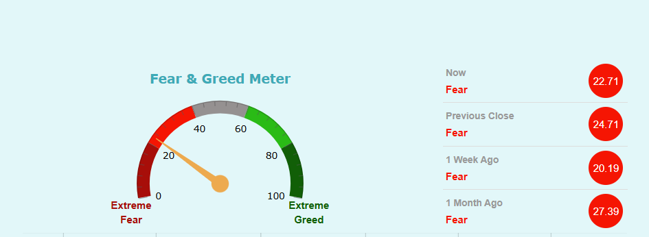 फियर एण्ड ग्रीड मिटरमा कम्पनीको शेयरमूल्य अहिले फियर जोनमा रहेको छ। यसले लगानीकर्ताहरुमाझ कम्पनीको शेयरमूल्य घट्छ भन्ने डर रहेको संकेत गर्दछ।