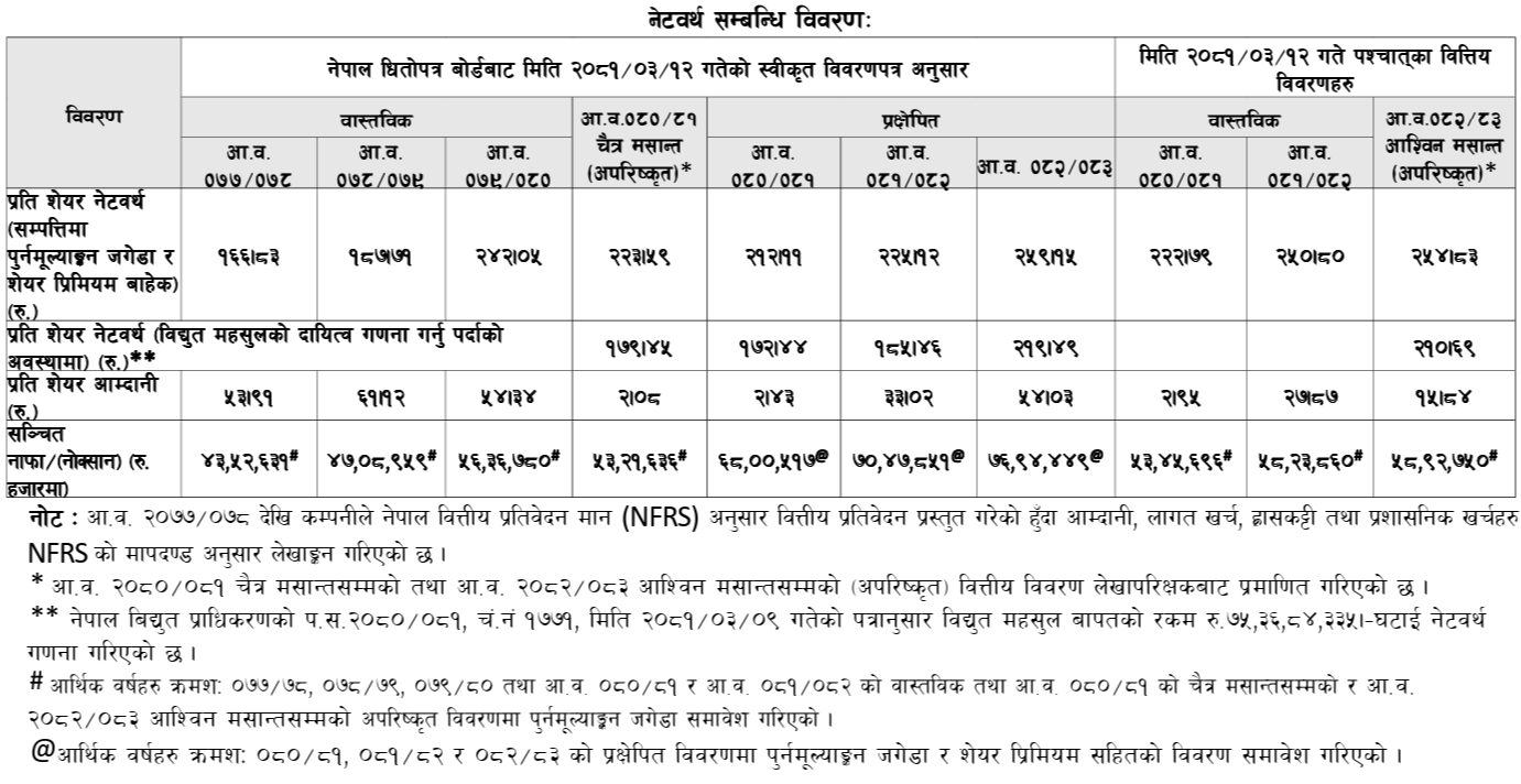 अपरिष्कृत वित्तीय विववरण अनुसार चालु आर्थिक वर्षको पहिलो त्रैमाससम्ममा कम्पनीको सञ्चित मुनाफा ५ अर्ब ८९ करोड २७ लाख ५० हजार रुपैयाँ रहेको छ। सो अवधिसम्ममा कम्पनीको प्रतिशेयर नेटवर्थ (विद्युत महसुलको दायित्व गणना गर्नुपर्दाको अवस्थामा) २१० रुपैयाँ ६९ पैसा रहेको छ भने प्रतिशेयर आम्दानी १५ रुपैयाँ ८४ पसा रहेको छ।