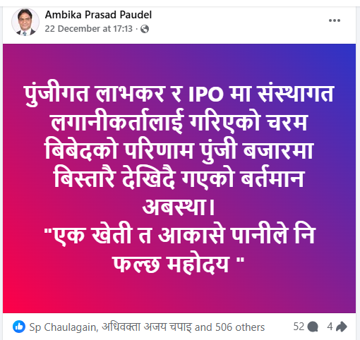 तर संस्थागत लगानीकर्तालाई प्रतिबन्ध लगाउने विषयमा नेपाल एक्लो देश हुन पुग्यो। “संसारको कुनै त्यस्तो देश भेटिँदैन जहाँ प्राथमिक निष्कासनमा संस्थागत लगानीकर्तालाई प्रतिबन्ध लगाइएको होस्। तर नेपालमा भने यो नियम लागु छ,” अम्बिका प्रसाद पौडेलले मेरो लगानीसँग भने।