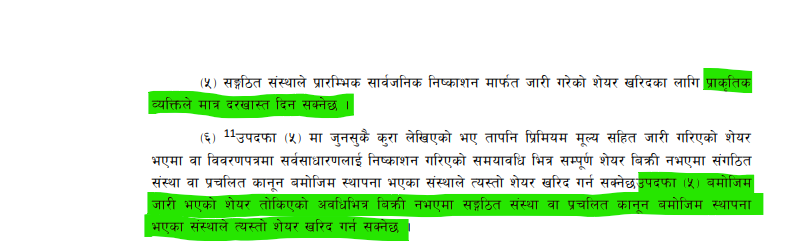 नेपालको पूँजी बजारमा निष्कासित प्राथमिक शेयरमा संस्थागत लगानीकर्ताले आवेदन दिन पाउँदैनन्। प्राथमिक निष्कासनमा प्राकृतिक व्यक्तिले मात्रै आवेदन दिन सक्छन्। यो नियम पहिले देखि नै लागु भएको भने होइन। २०७५ साल अघि प्राथमिक निष्कासनमा संस्थागत लगानीकर्ताले पनि खुलेर आवेदन दिन सक्थे। तर नेपाल धितोपत्र बोर्डको अध्यक्षको रुपमा डा.रेबत बहादुर कार्की आएपछि संस्थागत लगानीकर्तालाई प्राथमिक निष्कासनमा प्रतिबन्ध लगाइयो। कार्की २०७२ कात्तिकमा अध्यक्ष भएर आएका हुन्। उनी आएको केही वर्षमा नै संस्थागत लगानीकर्तालाई प्राथमिक निष्कासनमा प्रतिबन्ध लगाइयो। कार्कीले २०७५ सालमा धितोपत्र निष्कासन तथा बाँडफाँट निर्देशिका, २०७४ को पहिलो संशोधन गर्दै उक्त व्यवस्था कार्यान्वयनमा ल्याएका थिए। २०७५ असार ५ गते यता संस्थागत लगानीकर्तालाई प्राथमिक निष्कासनमा सहभागी हुन प्रतिबन्ध छ। उक्त संशोधित निर्देशिकाको निर्देशन २१ मा दरखास्त दिने न्यूनतम शेयर सङ्ख्या र दरखास्त साथ माग गर्न सकिने पेस्की रकम सम्बन्धी व्यवस्था छ। जसको (५) मा “सङ्गठित संस्थाले प्रारम्भिक सार्वजनिक निष्कासन मार्फत जारी गरेको शेयर खरिदका लागि प्राकृतिक व्यक्तिले मात्र दरखास्त दिन सक्नेछ,” भनिएको छ। यदि निष्कासित शेयर सबै बिक्री नभएमा भने संस्थागत लगानीकर्ताले आवेदन दिन सक्ने थप व्यवस्था निर्देशिकामा छ।