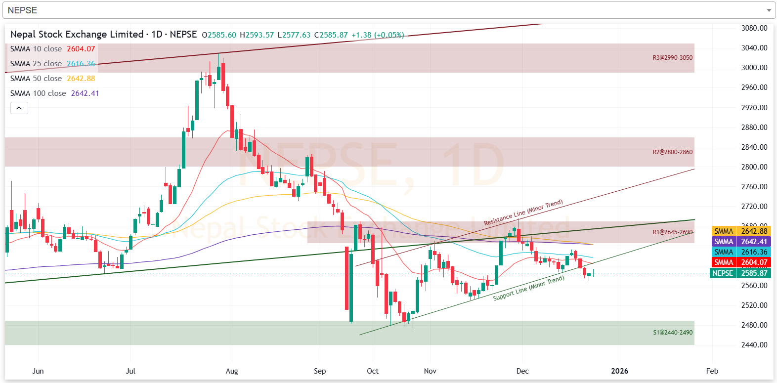 पछिल्लो साता प्रतिरोधको सामना गरी झरेको नेप्से, हाल पनि सोही अवस्थामा छ। हाल नेप्सेको प्रतिरोध क्षेत्र २६४५ देखि २६९० सम्म रहेको छ। आगामी दिनमा नेप्सेले ओरालो लागेमा २४४० देखि २४९० को क्षेत्रमा टेवा पाउने देखिन्छ।