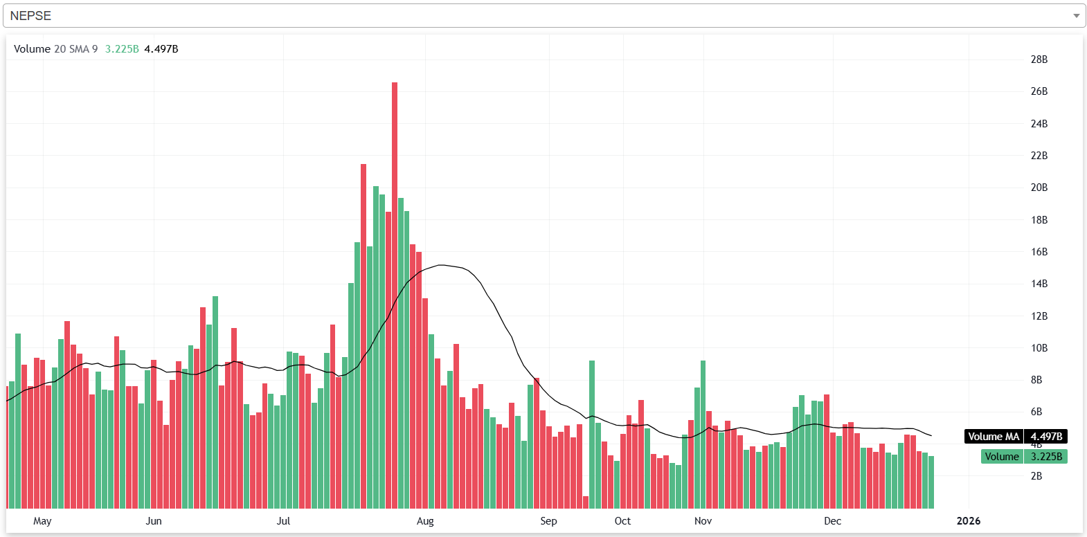 गत साता नेप्सेको भोल्यूम कमजोर रहेको छ। गत साता नेप्सेमा दैनिक औषतमा ३ अर्ब ६७ करोडको शेयर कारोबार भएको थियो। साताको अन्तिम कारोबार दिन नेप्सेको २० दिने औषत भोल्यूम ४ अर्ब ४९ करोड रहेको छ। २० दिने औषत भोल्यूमको तुलनामा गत साताको दैनिक औषत भोल्यूम १८.२६ प्रतिशत कम हो।