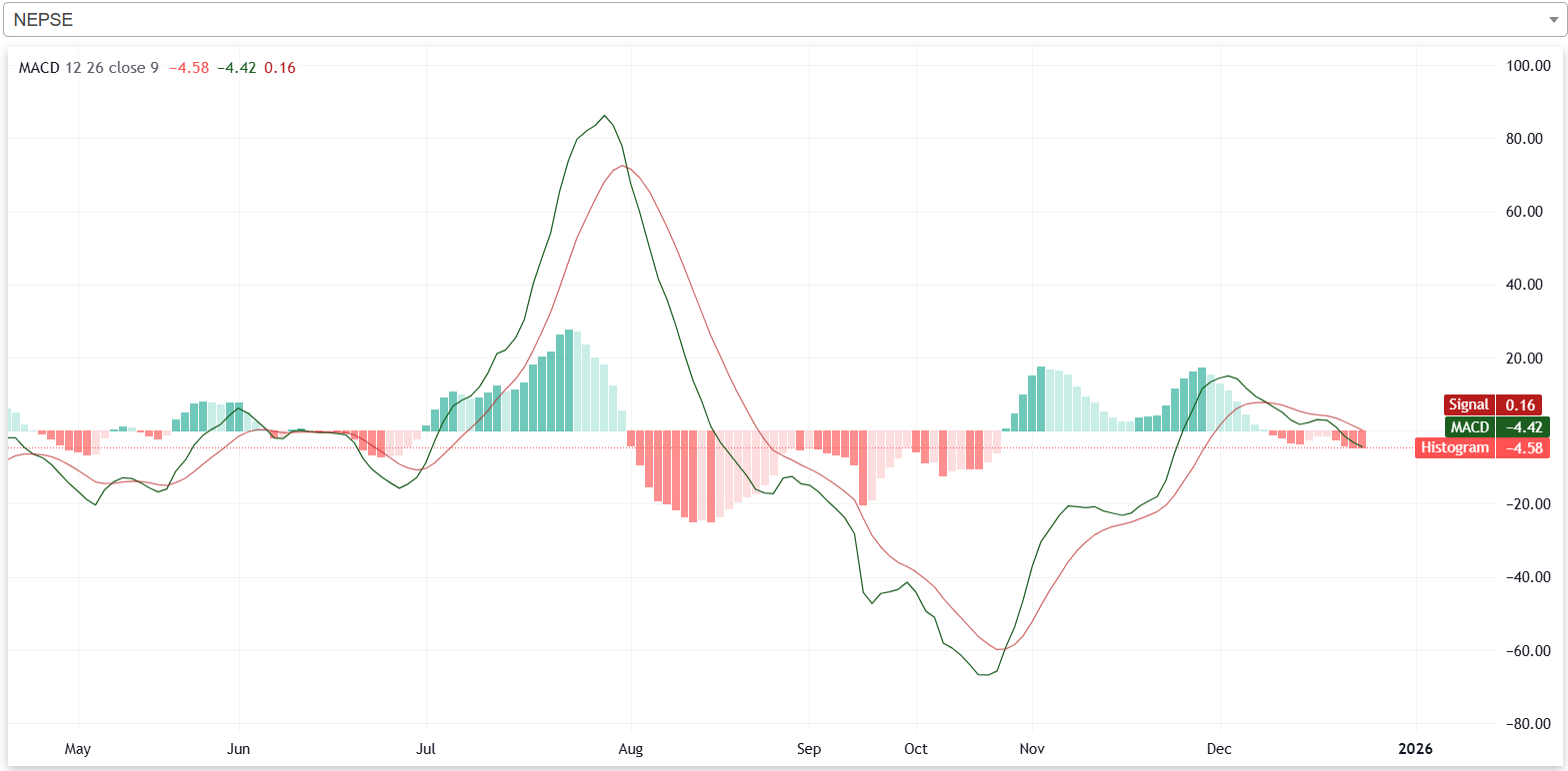 गत साता नेप्सेको एमएसिडी रेखा, सिग्नल रेखाभन्दा तल रहेको छ। त्यस्तै, नेप्सेको हिस्टोग्राम पनि नकारात्मक क्षेत्रमा रहेको छ। यसले गत साता नेप्से बियरिश प्रवृत्तिमा रहेको संकेत गर्दछ।