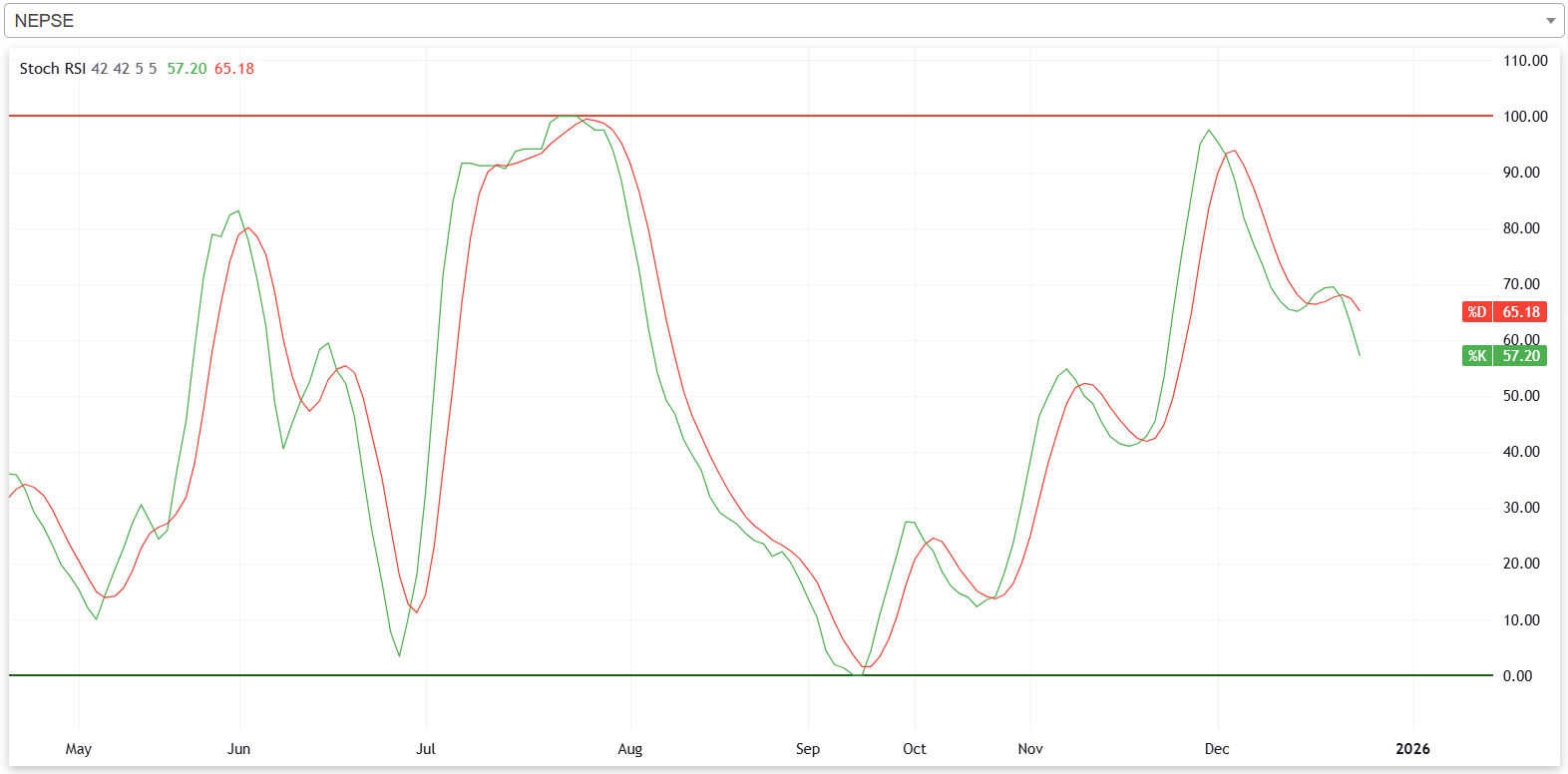 गत साता नेप्सेको स्टकास्टिक आरएसआई न्यूट्रल जोनमा रहेको छ। यसले गत साता बजारमा खरिदबिक्री चाप सन्तुलनमा रहेको संकेत गर्दछ।