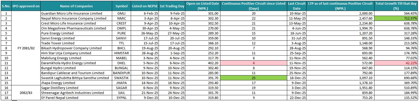 गत आव र र याे आर्थिक वर्षमा गरी अहिलेसम्म जम्मा १८ वटा कम्पनीहरु नेप्सेमा सूचीकृत भएका छन्। १८ कम्पनीमध्ये स्वस्तिक लघुवित्त लगातार २५ दिन सर्किट लागेर ३०९७.१० रुपैयाँसम्म पुगेको छ। स्वस्तिक लघुवित्तको मूल्य अंकित मूल्यमा यो ६ सय ९०.६८ प्रतिशतले मूल्य बढेको पाइएको छ। त्यस्तै नेपाल माइक्रो इन्स्योरेन्स २२ कारोबार दिनसम्म सर्किट लागेर २४ सय ५७.६० रुपैयाँसम्म पुगेको थियो। यता क्रेस्ट माइक्रो लाइफ र ओम मेगाश्री फर्मास्युटिकल्स लगातार २१-२१ दिन सर्किट लागेर क्रमशः २२३४.८० रुपैयाँ र १९९४.७० रुपैयाँ सम्म शेयर मूल्य पुगेको थियो। त्यस्तै गार्डियन माइक्रो लाइफ इन्स्योरेन्स लगातार २० दिन सर्किट लागेर २ हजार रुपैयाँसम्म पुगेको थियो।