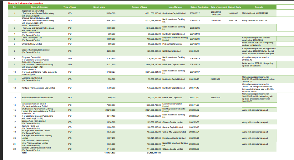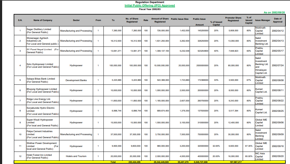 आर्थिक वर्ष २०८२/८३ मा बोर्डको पुस २० गतेसम्मको तथ्याङ्क अनुसार, जम्मा १२ वटा कम्पनीले मात्रै निष्कासनको अन्तिम स्वीकृति पाए। ती १२ कम्पनीले कुल ५ अर्ब ५४ करोड ५७ लाख रुपैयाँ बराबरको शेयर निष्कासन अनुमति पाएका हुन्। अनुमति पाउने वास्तविक क्षेत्रका कम्पनीमा सागर डिस्टिलरीदेखि पाल्पा सिमेन्टसम्मका कम्पनीहरू छन्।