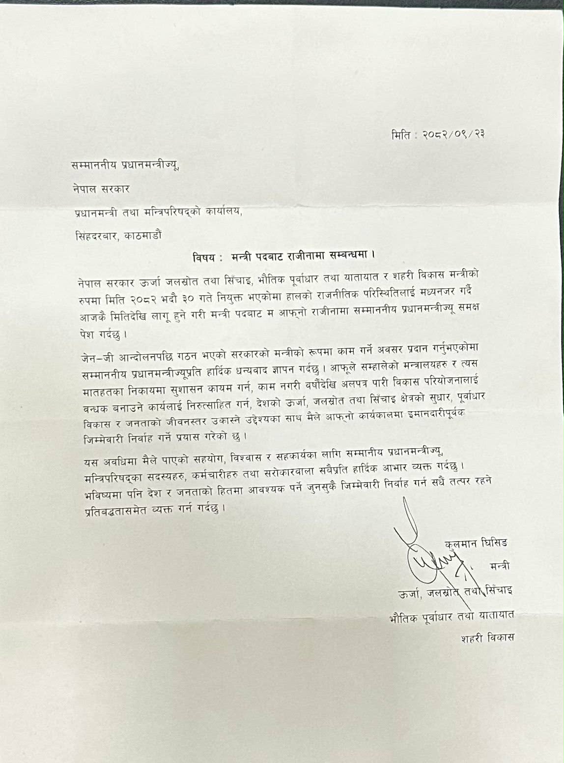 भदौ २३,२४ को जेनजी आन्दोलनपछि गठन भएको नागरिक सरकारमा घिसिङ भदौ ३० गते मन्त्री नियुक्त भएका थिए । त्यसको ४ महिना पनि नपुग्दै उनले राजीनामा दिएका छन् ।