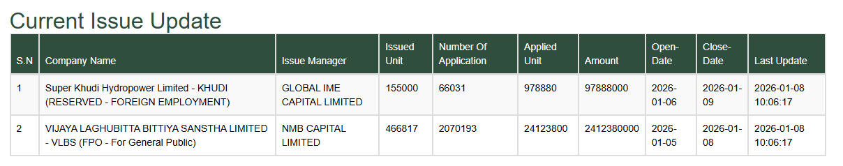 त्यसैगरी, सुपर खुदी हाइड्रोपावर लिमिटेडले वैदेशिक रोजगारीमा रहेका नेपालीहरूका लागि निष्कासन गरेको आईपीओमा पनि राम्रो आवेदन परेको छ। १ लाख ५५ हजार कित्ता सेयर निष्कासन गरिएकोमा ६६ हजार ३१ जना आवेदकबाट ९ लाख ७८ हजार ८ सय ८० कित्ताका लागि आवेदन परेको छ।