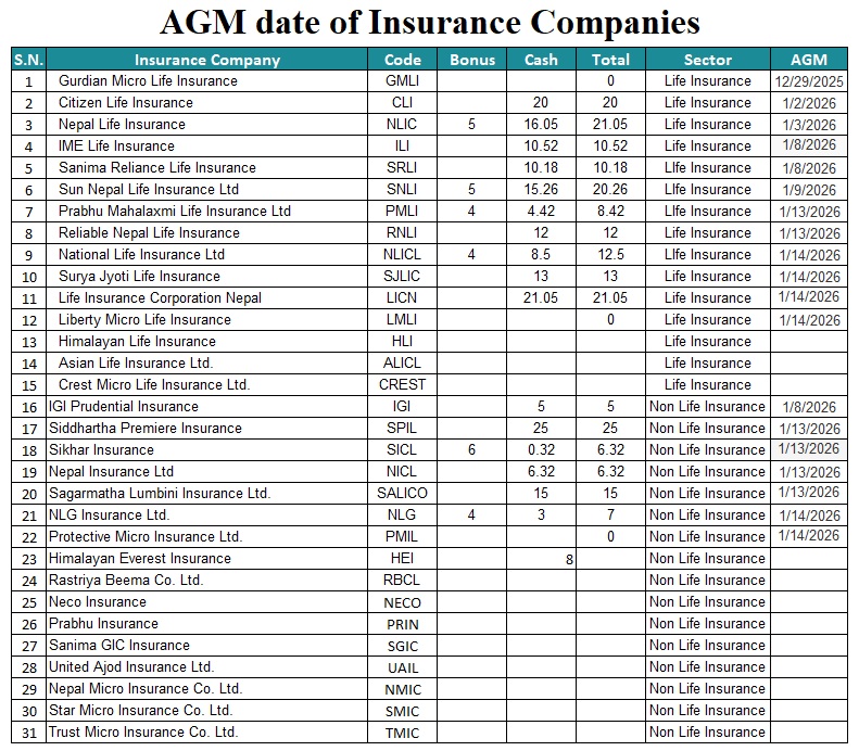 यता निर्जीवन कम्पनीहरुमा ७ वटा कम्पनीले पुस मसान्तभित्रै साधारण सभा गर्ने गरी सूचना सार्वजनिक गरेका छन् । निर्जीवन बीमा कम्पनीतर्फ आइजीआई प्रुडेन्सियल इन्स्योरेन्सको मात्रै साधारण सभा सम्पन्न भएको छ । कम्पनीले शेयरधनीलाई ५ प्रतिशत नगद लाभांश घोषणा गरेको थियो । त्यस्तै सिद्धार्थ प्रिमियर इन्स्योरेन्सले सबैभन्दा बढी २५ प्रतिशत लाभांश घोषणा गरेको थियो । शिखर इन्स्योरेन्सले ६ प्रतिशत बोनस र ०.३२ प्रतिशत नगद गरी ६.३२ प्रतिशत र नेपाल इन्स्योरेन्सले ६.३२ प्रतिशत नगद लाभांश घोषणा गरेको थियो ।सगरमाथा लुम्बिनी इन्स्योरेन्सले १५ प्रतिशत नगद लाभांश, एनएलजी इन्स्योरेन्सले ४ प्रतिशत बोनस र ३ प्रतिशत नगद गरी ७ प्रतिशत लाभांश घोषणा गरेको थियो । साधारण सभा घोषणा गरेका निर्जीवन बीमा कम्पनीमध्ये प्रोटेक्टिभ माइक्रो इन्स्योरेन्सले कुनै लाभांश घोषणा गरेको छैन ।