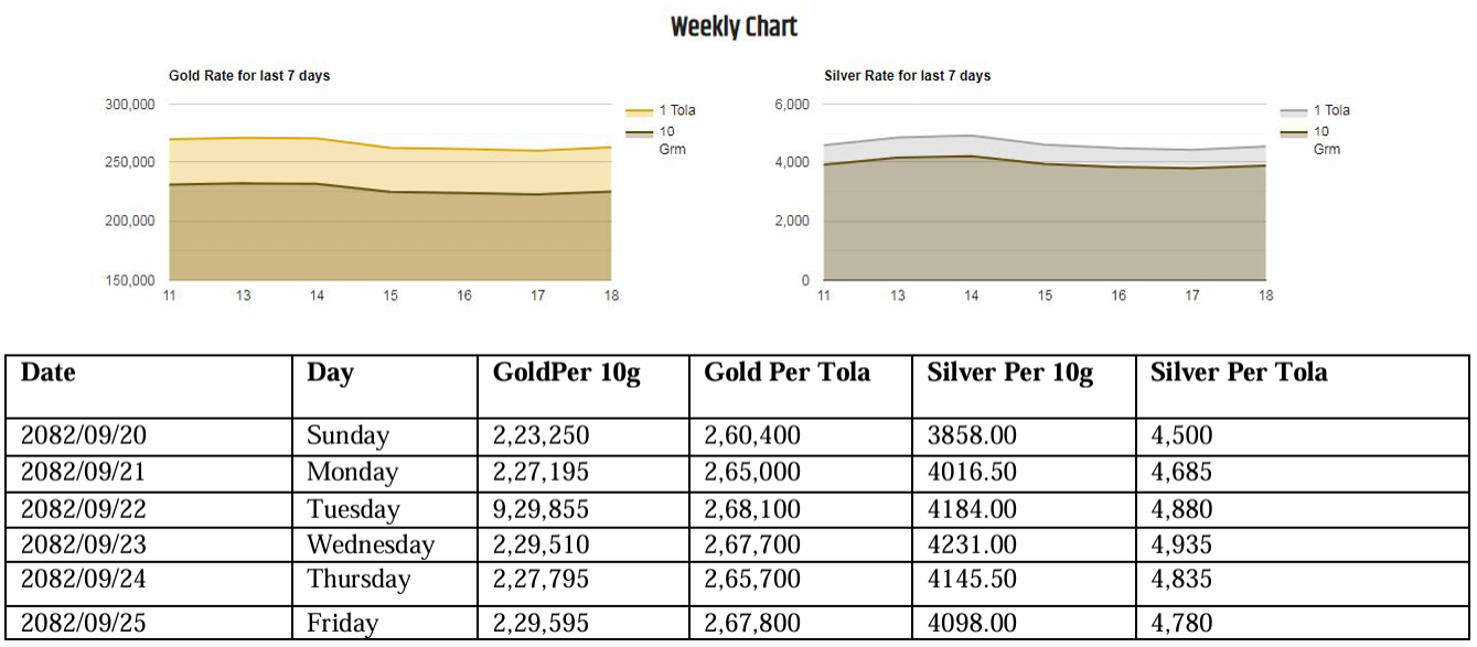 नेपाल सुनचाँदी व्यवसायी महासंघका अनुसार, गत पुस २० गते आइतबार सुनको मूल्य ४ हजार ६०० रुपैयाँ बढेर प्रतितोला २ लाख ६५ हजार रुपैयाँमा कारोबार भएको थियो । त्यस्तै, पुस २१ गते सोमबार पुनः ३ हजार १०० रुपैयाँले बढेर २ लाख ६८ हजार १०० रुपैयाँमा कारोबार भएको थियो ।