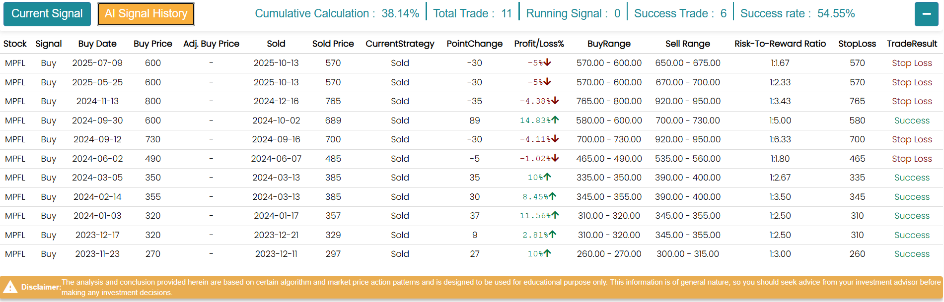 मेरोलगानी एआईले हालसम्म फाइनान्सको शेयरमा ११ पटक बाइ सिग्नल दिइसकेको छ। जसमध्ये ६ सिग्नलबाट लगानीकर्ताहरुले नाफा कमाएका थिए भने ५ सिग्नलमा स्टप लस गर्नु परेको थियो। हाल मेरोलगानी एआईले फाइनान्सको शेयरमा कुनै सिग्नल दिएको छैन।