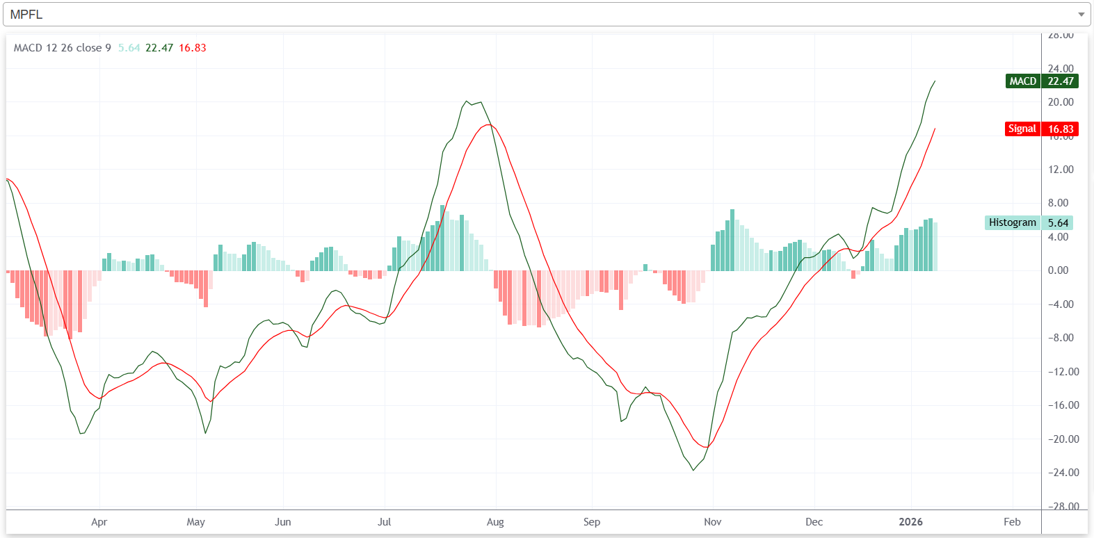 प्राविधिक विश्लेषणको अर्को उपकरण एमएसिडीमा यस साता फाइनान्सको शेयरमूल्यले बुलिश प्रवृत्तिमा रहेको छ। यस साता फाइनान्सको एमएसिडी रेखा, सिग्नल रेखाभन्दा माथि रहेको छ भने हिस्टोग्राम सकारात्मक क्षेत्रमा रहेको छ। एमएसिडी रेखा र सिग्नल रेखा बीचको दूरी बढ्दो क्रममा रहेको छ भने हिस्टोग्रामको उचाई साताको अन्तिम कारोबार दिन घटेको छ।