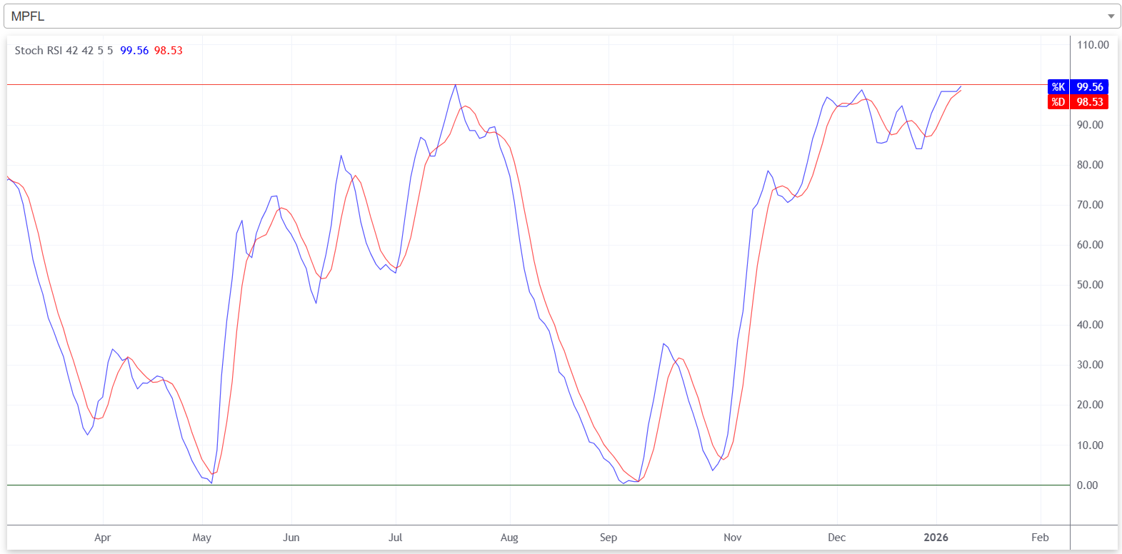 स्टकास्टिक आरएसआई अनुसार फाइनान्सको शेयरमूल्य अहिले ओभरबट जोनमा रहेको छ। यसले बजारमा फाइनान्सको शेयरमा बिक्रीचापको तुलनामा खरिदचाप बढी रहेको संकेत गर्दछ।