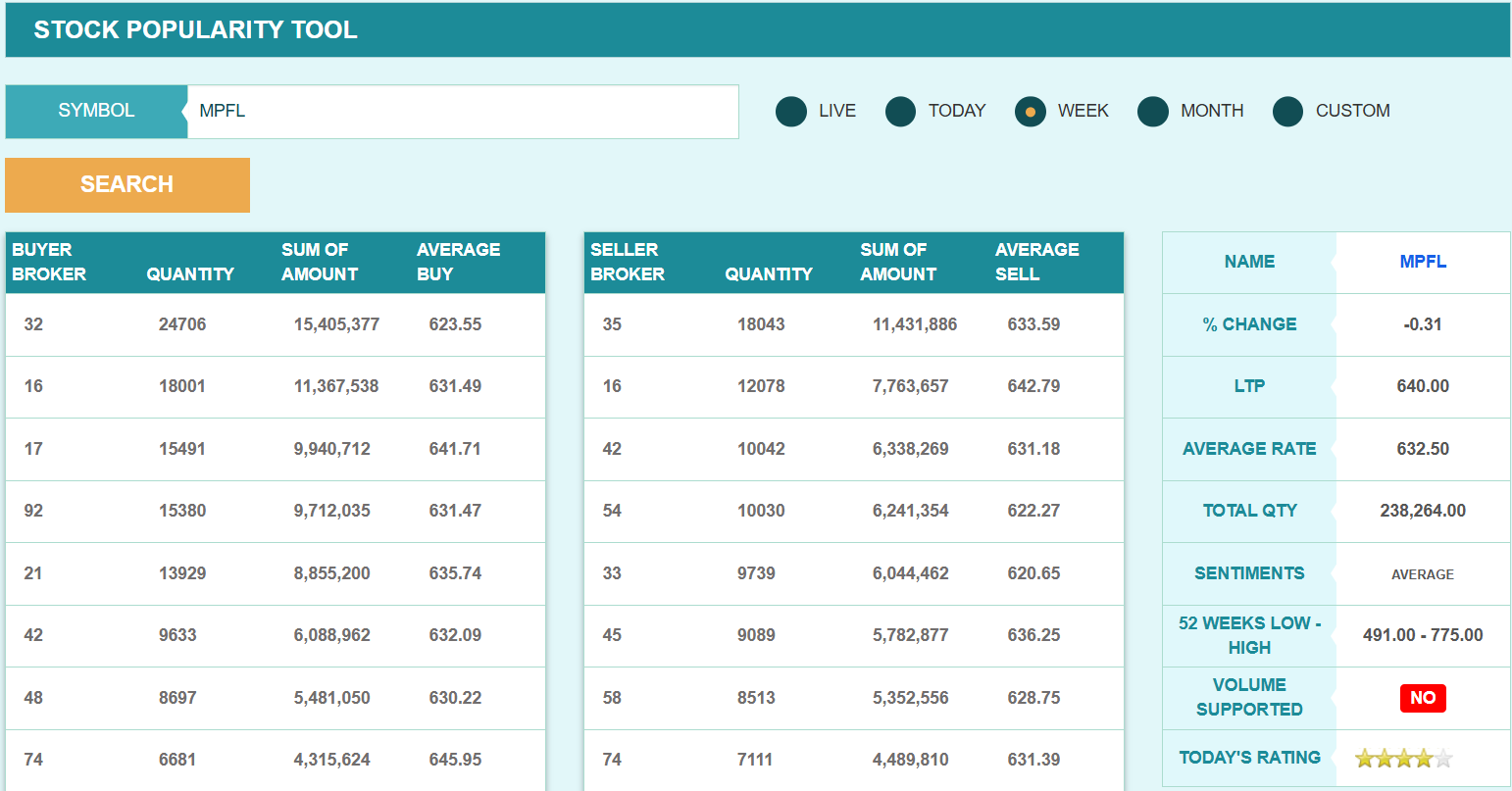 यस साता ब्रोकर नम्बर ३२ ले फाइनान्सको सबैभन्दा बढी शेयर खरिद गरेको छ। सो ब्रोकरले यस साता फाइनान्सको २४ हजार ७०६ कित्ता खरिद गरेको छ। त्यसैगरी, यस साता ब्रोकर नम्बर १६ ले १८ हजार कित्ता शेयर खरिद गरेको छ। यस साता ब्रोकर नम्बर ३५ ले फाइनान्सको सबैभन्दा बढी १८ हजार ४३ कित्ता शेयर बिक्री गरेको छ।